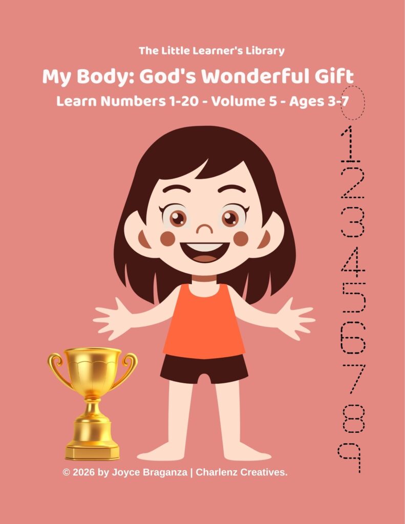 Designed for children ages 3–7, this 45-page book introduces numbers in figures and words through gentle, engaging activities that support early numeracy and positive body awareness rooted in faith.